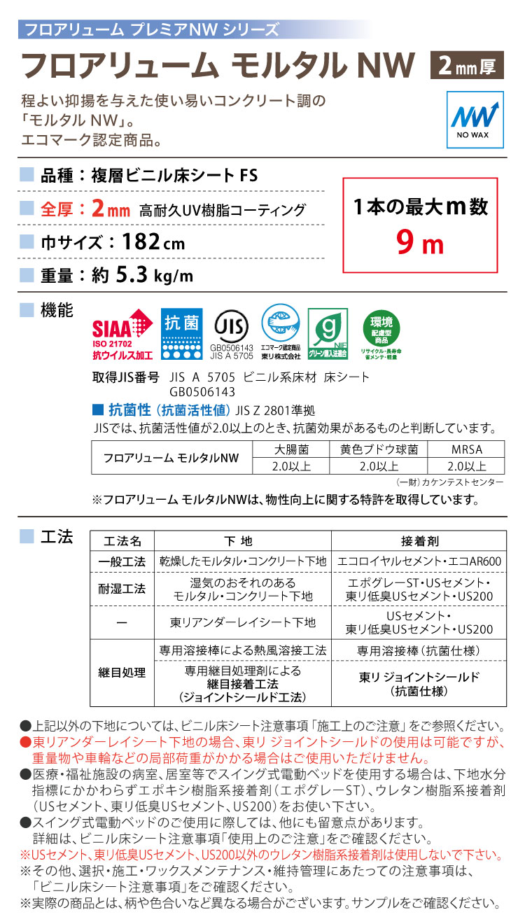 東リ 長尺シート フロアリューム モルタルNW プレミアNWシリーズ 182cm巾 2mm厚 抗菌 石目調 [1m以上10cm単位 切売り]