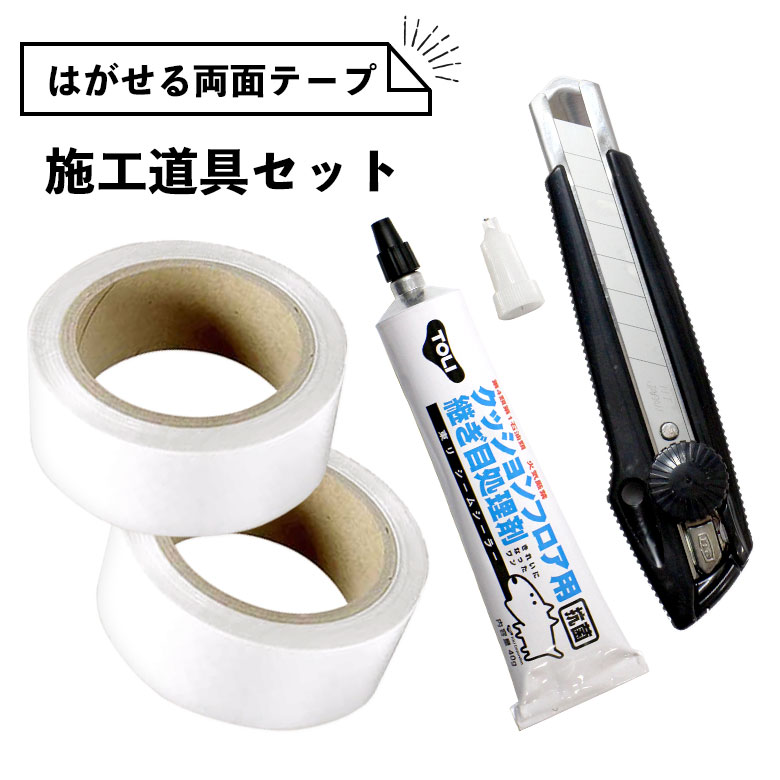 ![]() ▲はがせる両面テープ+継ぎ目処理剤+カッターの3点セット※現在のページです。 | ![]() ▲はがせる両面テープ+継ぎ目処理剤の2点セット | ![]() ▲はがせる両面テープ+カッターの2点セット |