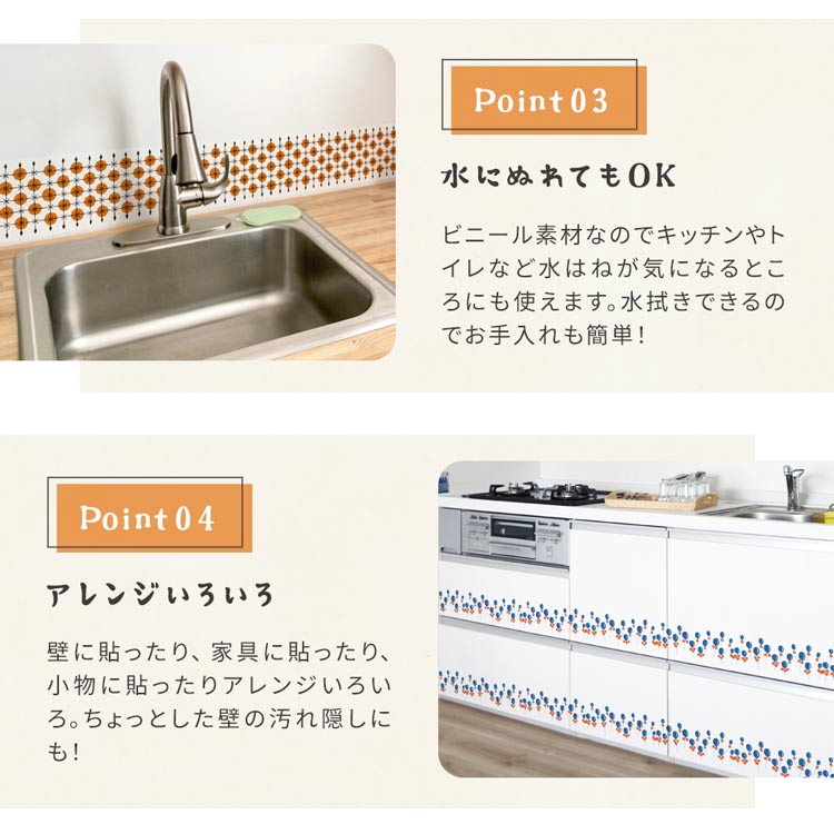 はってはがせるシールタイプで壁のアクセントにはもちろん家具のリメイクにもおすすめ。