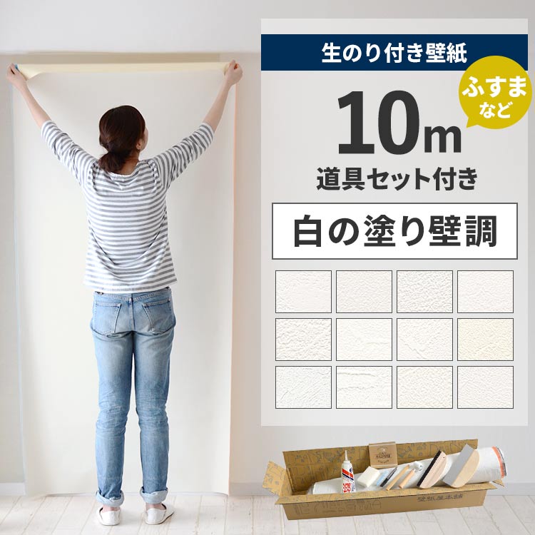 壁紙 のり付き 10m 道具 セット クロス 張り替え 自分で 白 ホワイト 塗り壁調 補修 貼り方マニュアル付き 初心者セット