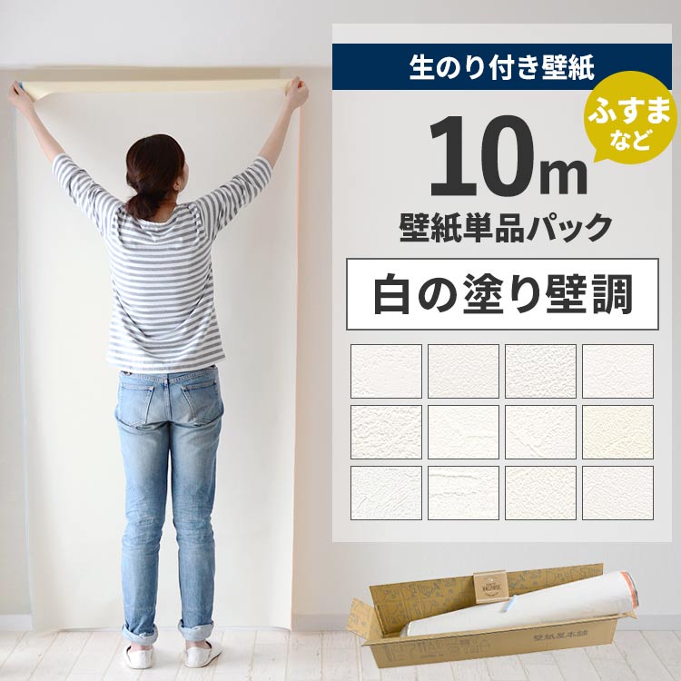 壁紙 のり付き 10m クロス 張り替え 自分で白 ホワイト 塗り壁調 補修 替え刃 貼り方マニュアル付き