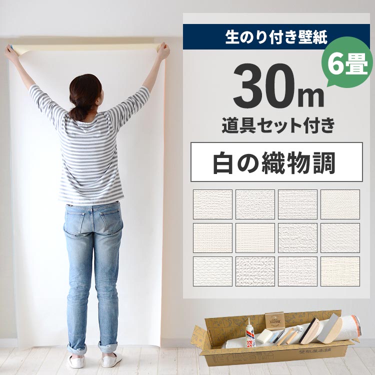 壁紙 のり付き 30m 道具 セット クロス 張り替え 自分で 白 ホワイト 織物調 補修 貼り方マニュアル付き 初心者セット 6畳