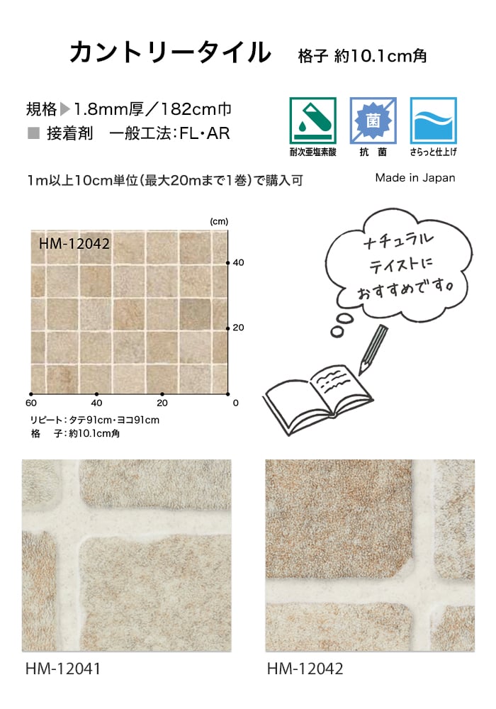 クッションフロア タイル柄 住宅用 サンゲツ 182cm巾 1.8mm厚 カントリータイル