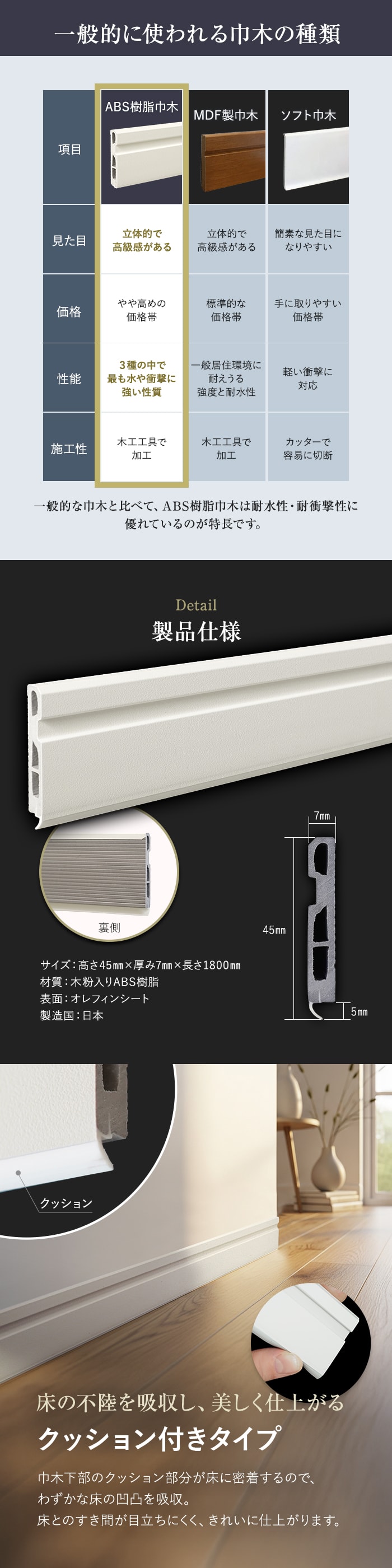 巾木 クッション付き巾木60 高さ60mm 厚さ7mm 長さ1800mm 1本 白