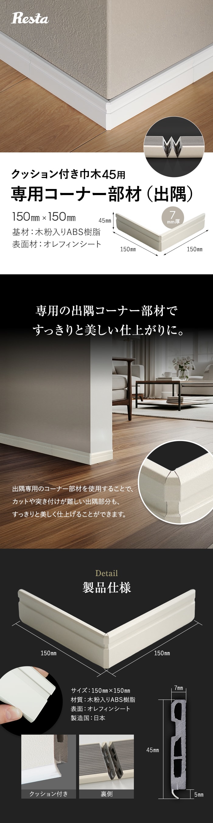 巾木 クッション付き巾木60用 出隅 コーナー部材 1個 白