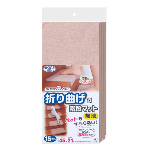 ・折り曲げ付きで、足裏にやさしいソフトな踏みごこちになります。 ・おくだけで取り付け、取り外しが簡単。 ・マットの裏面が、階段にピタッと吸着するのでズレません。 ・ハサミで手軽にカットできます。カットしてもほつれません。 ・防音効果があり、足音を吸収します。 ・掃除機をかけても吸いつかず、楽にお掃除できます。 ・1枚ずつ洗濯機で丸洗いできます。 ・15枚入。