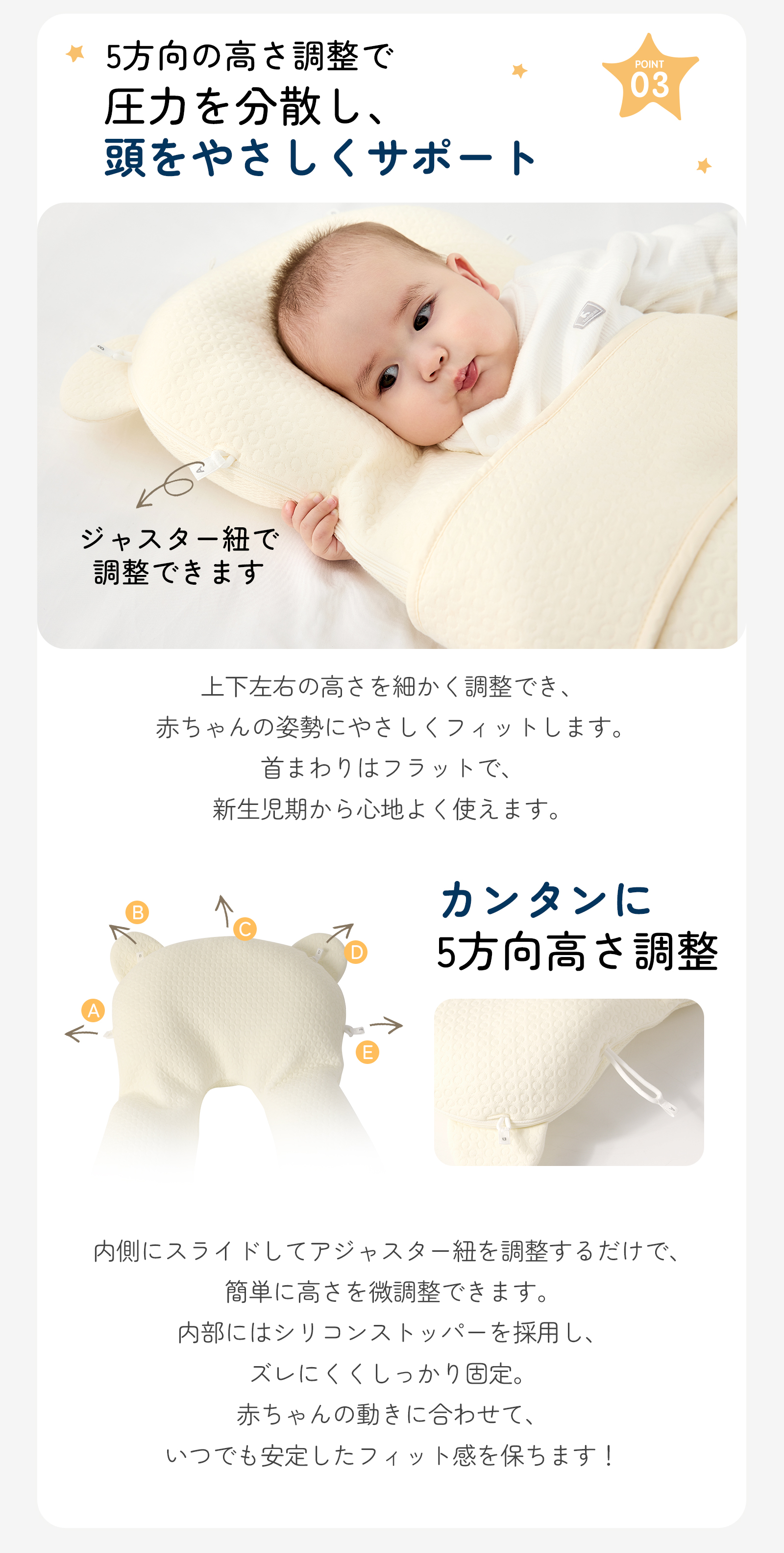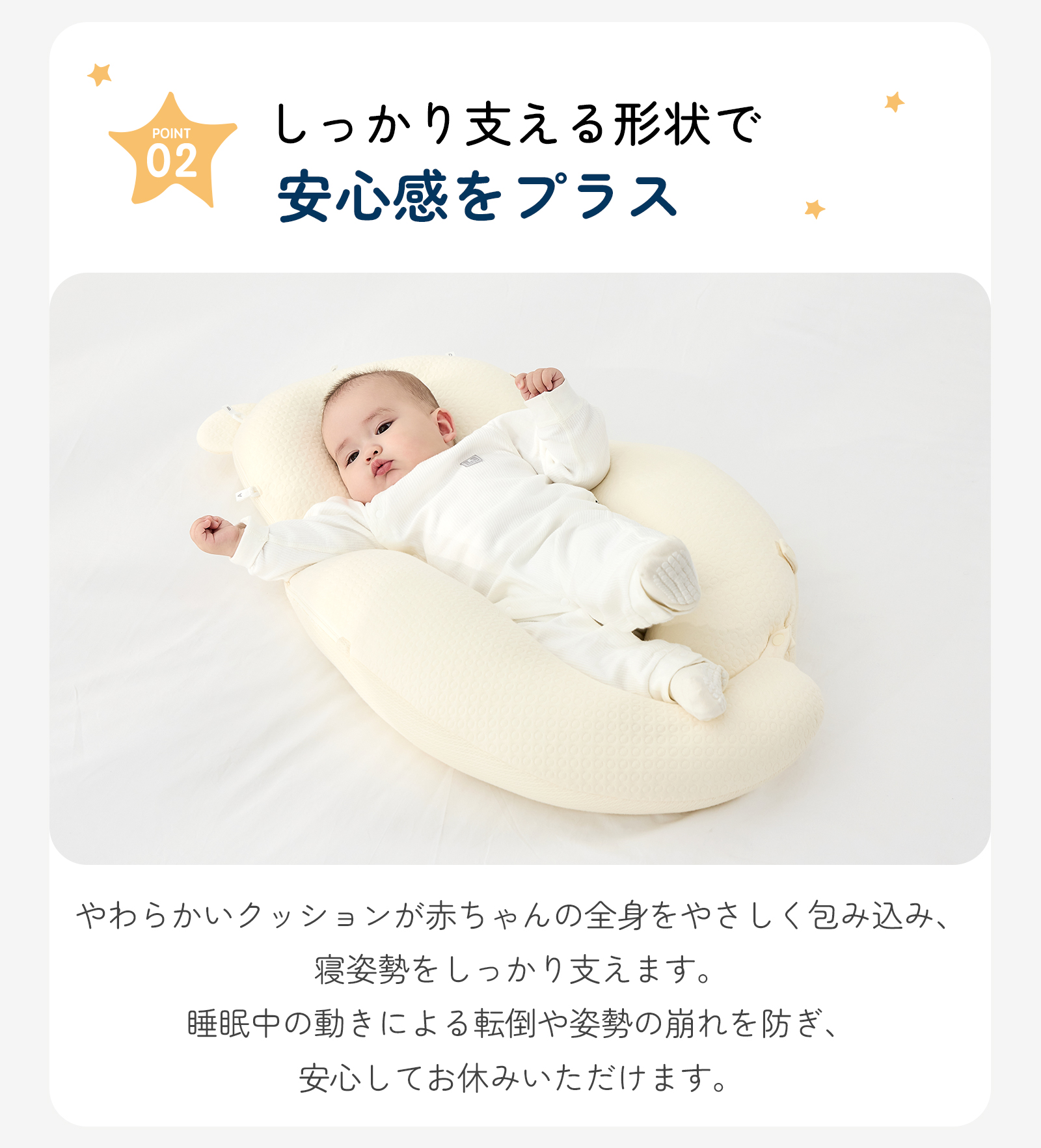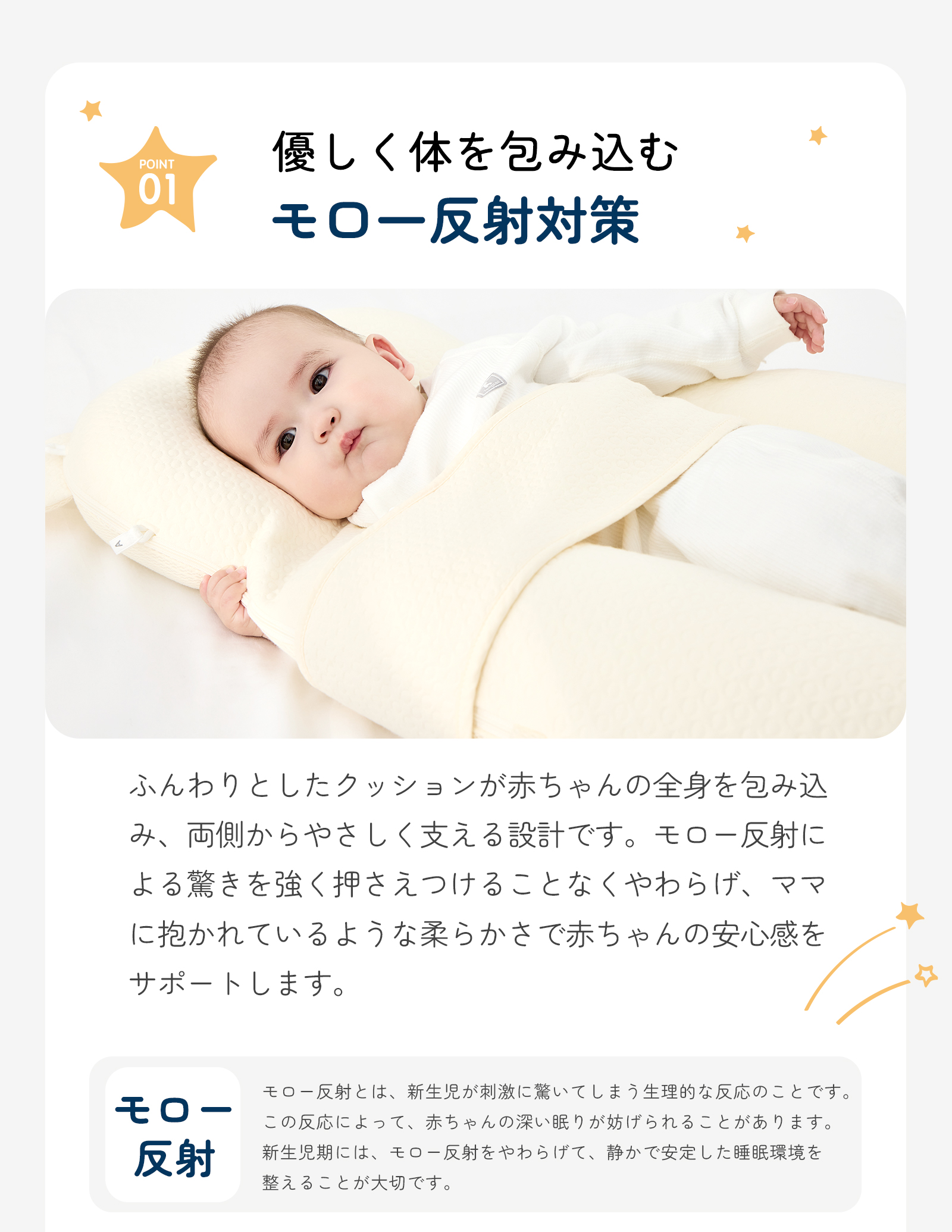 使い方の目安:新生児から。成長に合わせてサイズを3段階で調整できます。就寝時やお昼寝時の向き癖サポート・モロー反射対策の補助としてご使用ください。