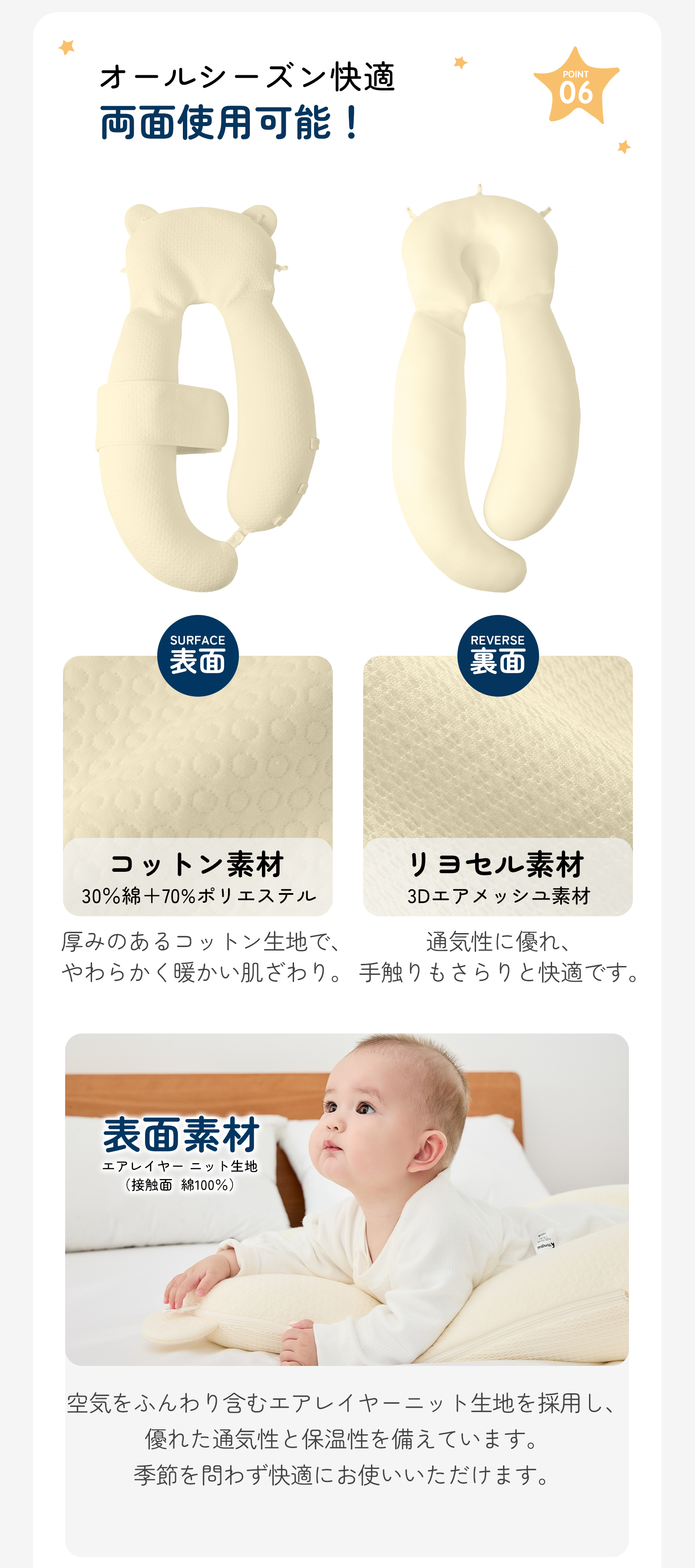 丸洗いOK: カバーはもちろん、本体も洗濯機(ネット使用)で洗えます。吐き戻しや汗も気にせず、いつでも清潔。