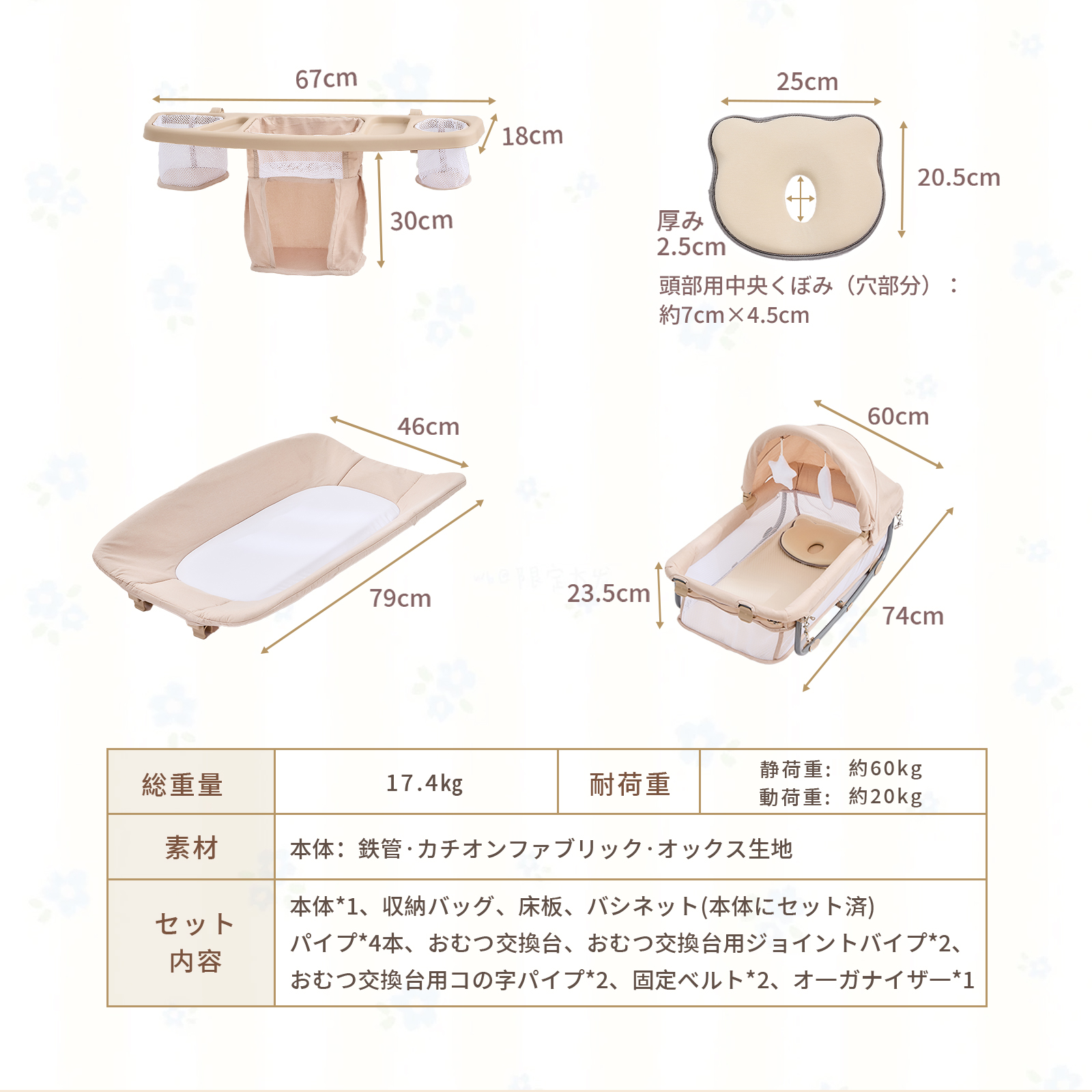 本体×1、収納バッグ、床板、バシネット(本体にセット済)、パイプ×4本、おむつ交換台、おむつ交換台用ジョイントバイプ×2、おむつ交換台用コの字パイプ×2、固定ベルト×2、オ一ガナイザ一×1