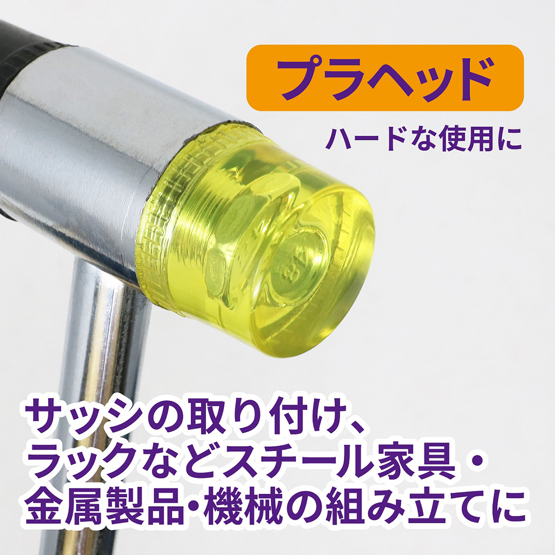 プラヘッドでは、サッシの取り付け、ラックなどスチール家具、金属製品、機械の組立に。ゴムヘッドでは、ホゾの組み立て、アングル家具、木製品の組み立てに。キズつけたいくない物の加工、組み立て作業に最適。
