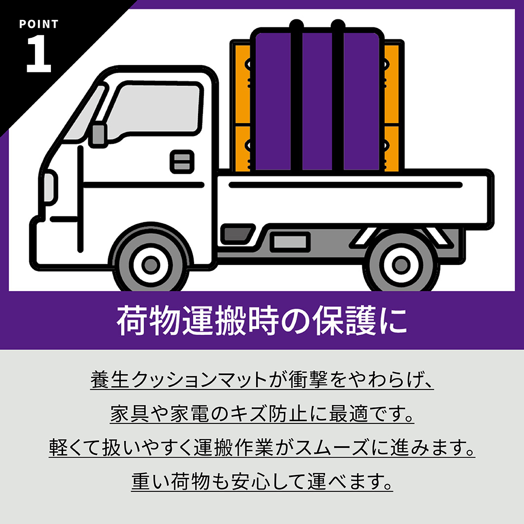1.荷物運搬時の保護に養生クッションマットが衝撃をやわらげ、家具や家電のキズ防止に最適です。
