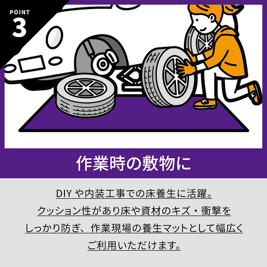 クッション性があり床や資材のキズ・衝撃をしっかり防ぎ、作業現場の養生マットとして幅広くご利用いただけます。