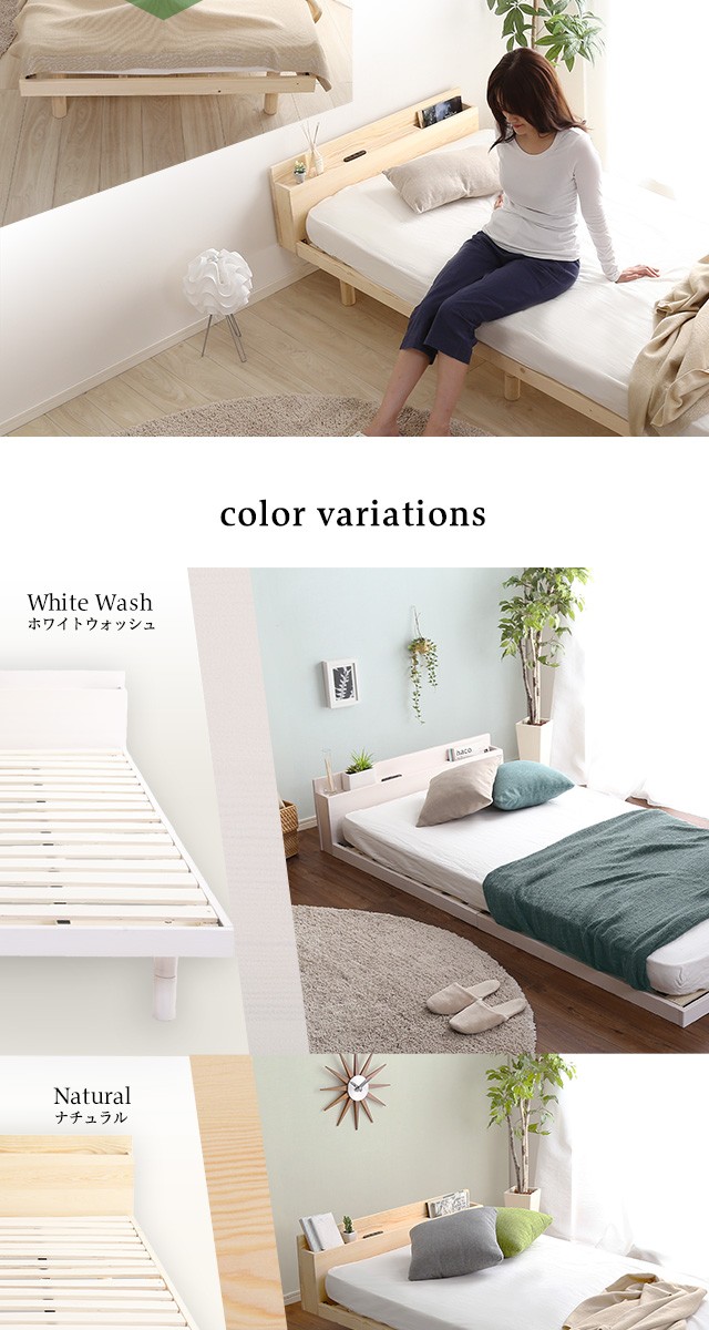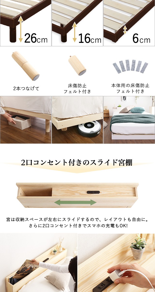 明日着く あす着く ベッド ダブル ベット おしゃれ 安い 北欧 2人 二人 ローベッド ロータイプ フロア 低い すのこ 通気性 除湿 カビ 宮 床下 収納 棚 コンセント スマホ 充電 高さ調整 高さ調節 脚付き ルンバ 布団を敷ける マットレスなし ナチュラル ブラウン ホワイト 白 激安
