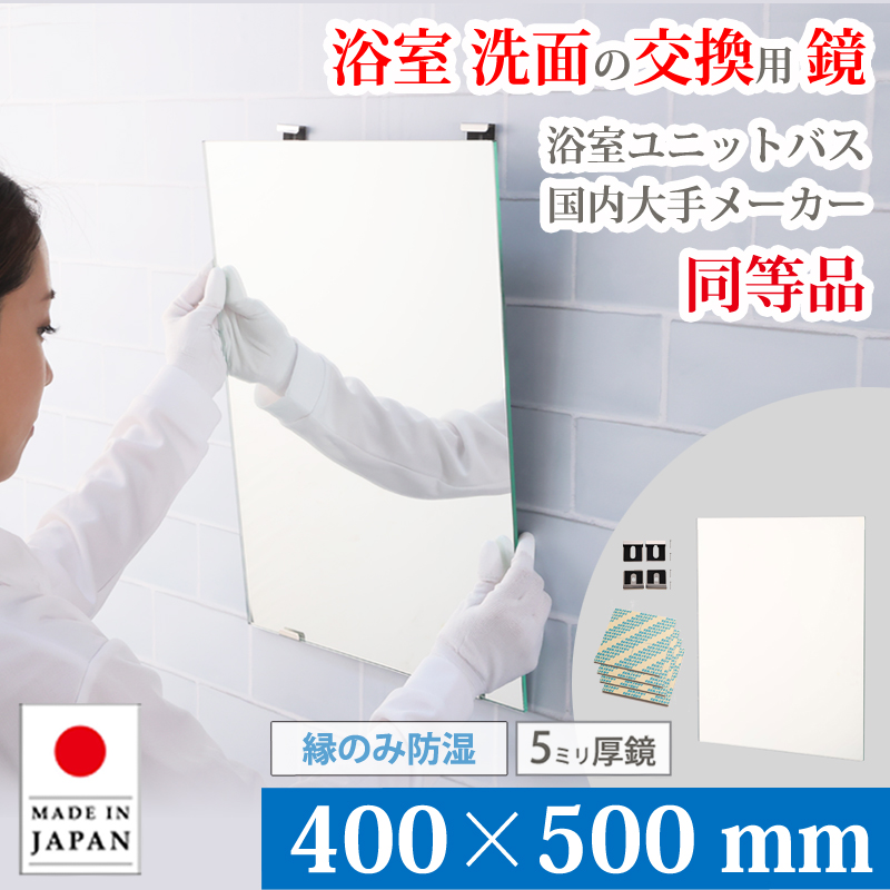 鏡 浴室 交換用 ミラー 400×500 mm 厚み 5mm M5 縁のみ防湿 取付資材付き ガラス 日本製 AGC ユニットバス お風呂 浴室鏡 洗面鏡 大阪 鏡販売 1年保証