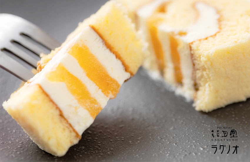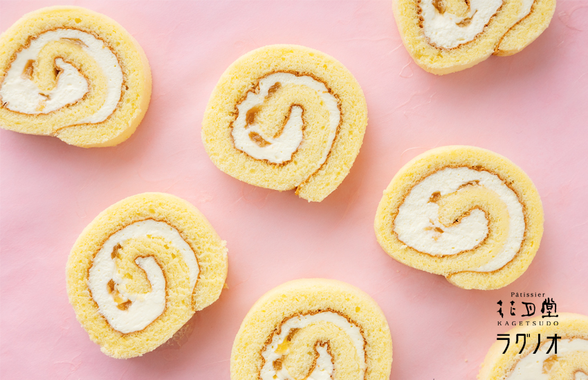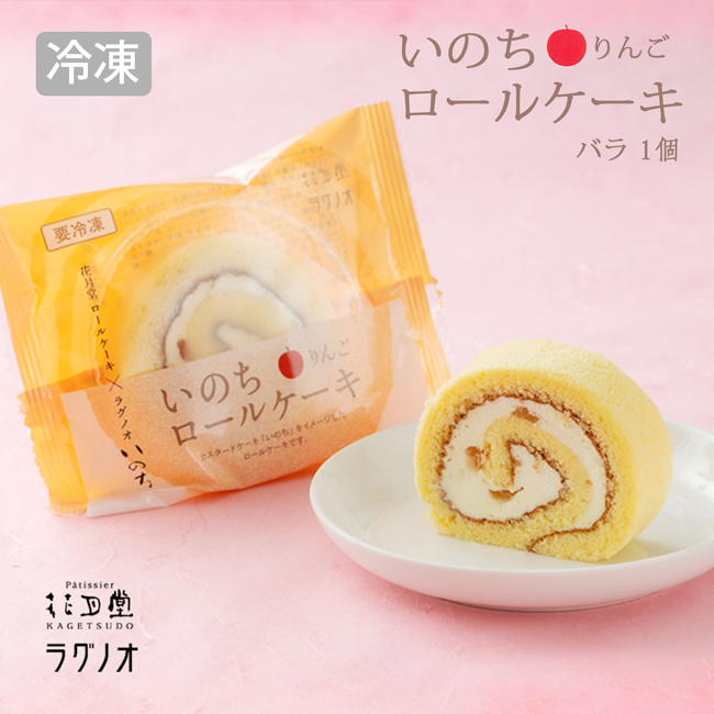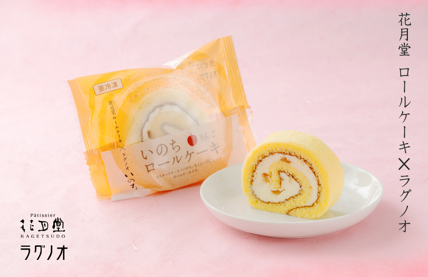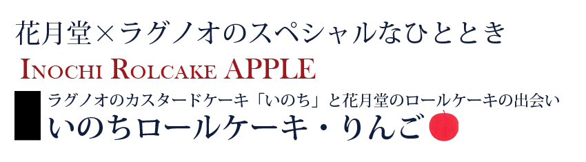 | 花月堂×ラグノオ 甘くて美味しいスペシャルコラボレーションが新登場! ラグノオのカスタードケーキ「いのち」をイメージしたロールケーキです。 カスタードクリームにホイップクリームを加えた軽やかでコクのあるクリームのアップルソース入りロールケーキです。 |