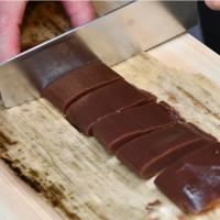 江戸時代の終わりごろから、でっち奉公人が関東のお店へ出向くとき、又は3年目の里帰りを許され再びお店へ出向くとき、この羊羹をお土産として持たされたと言われています。竹の皮香る、風味豊かな蒸し羊羹です。