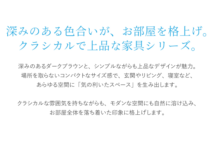 深みのあるダークブラウンと、シンプルながらも上品なデザインが魅力の家具シリーズ。