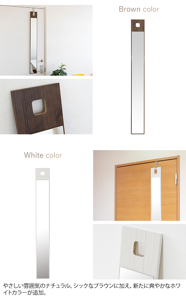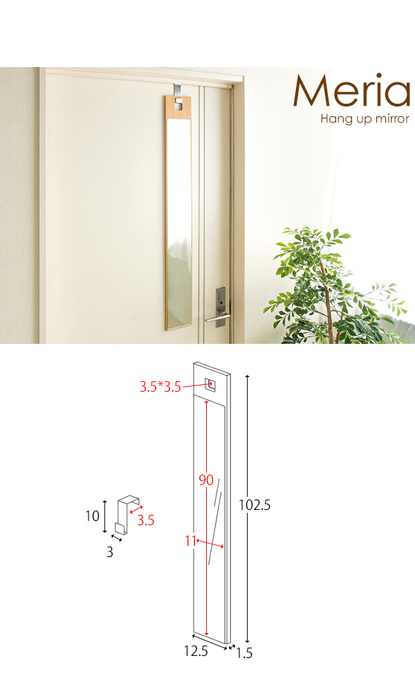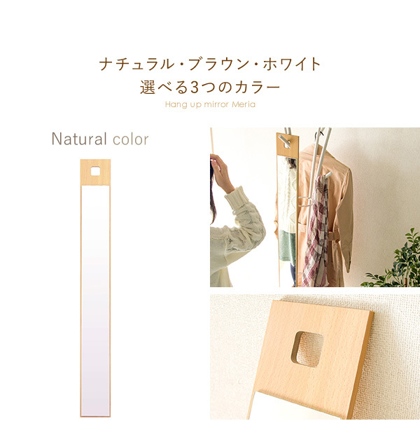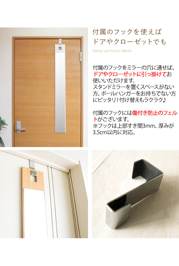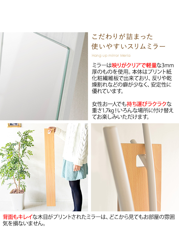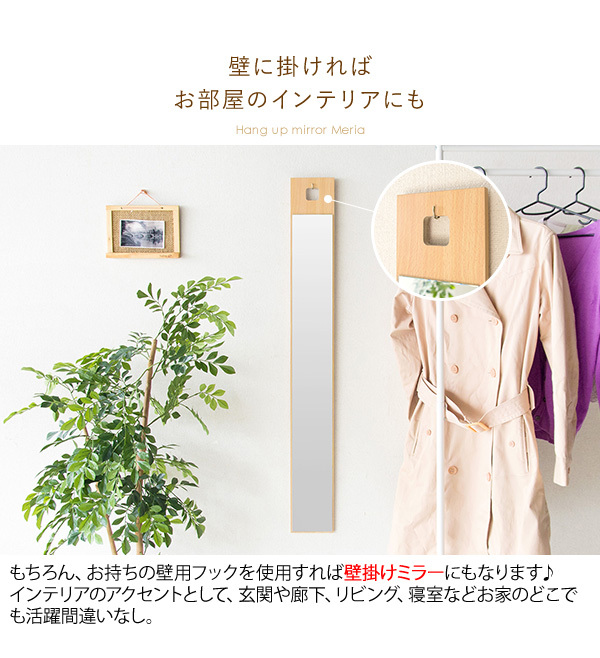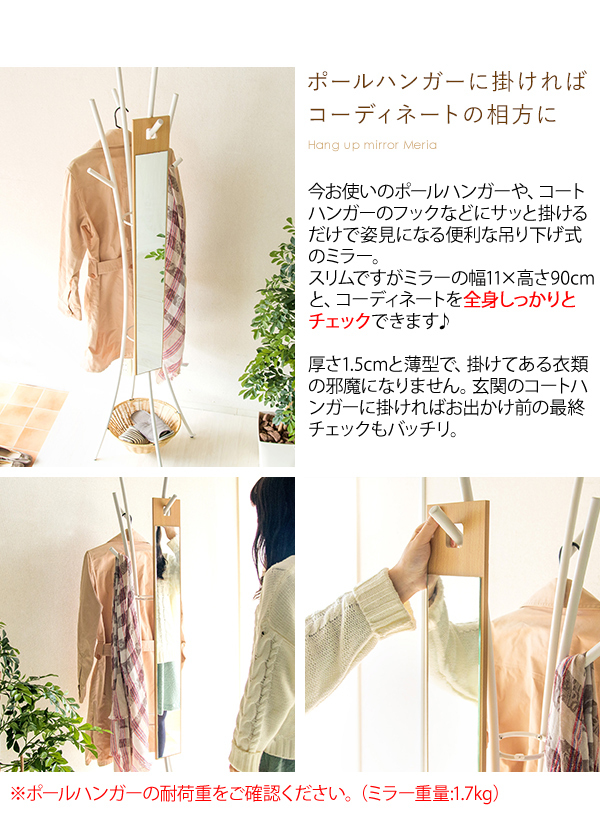 スリム&軽量な吊り下げスリムミラー。 上部の穴をポールに引っかければ、すぐに使える姿見に。