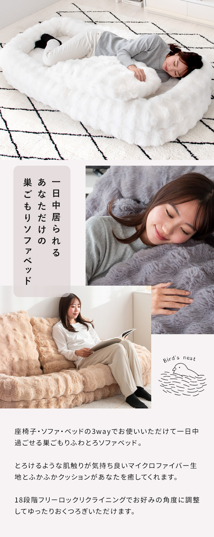 座椅子・ソファ・ベッドの3wayでお使いいただけて一日中過ごせる巣ごもりふわとろソファベッド。