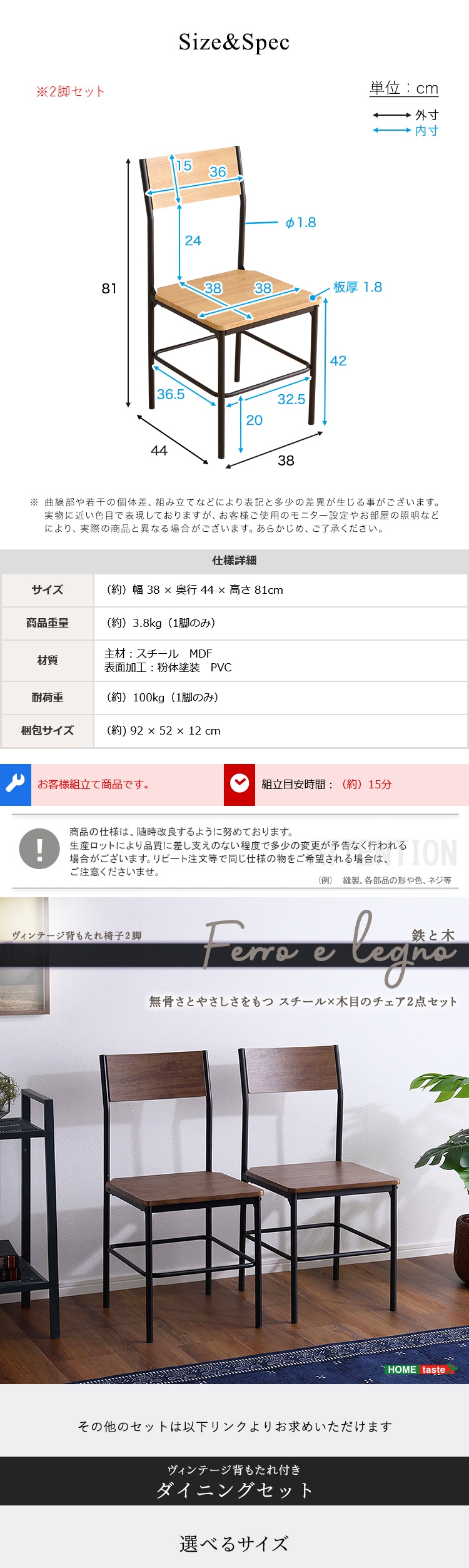 ダイニングチェア 2脚セット 椅子 イス チェア おしゃれ 木製 スチール アイアン カフェ風 食卓椅子 デスクチェア
