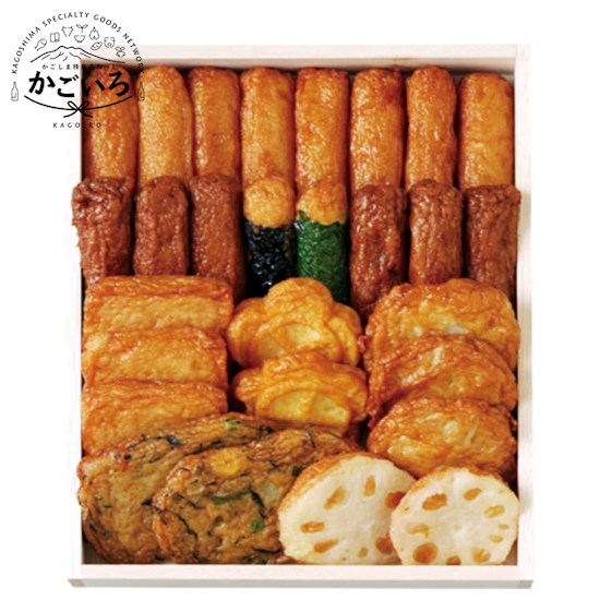魚肉(タラ、イトヨリダイ、エソ、イワシ、ミナミダラ)、小麦でん粉、鹿児島県産地酒、砂糖、にんじん、ごぼうい、れんこん、食塩、ひじき、きゃべつ、玉ねぎ、植物油脂(なたね油)、とうもろこし、グリンピース、にら、もやし、ごま、しょうが、ごま油、のり、しそ /調味料(アミノ酸等)、着色料(クチナシ色素)、保存料(ソルビン酸)、(一部に小麦、卵、乳、大豆、ごま、ゼラチン、牛肉を含む)
