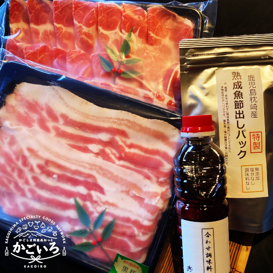 黒豚(肩ローススライス)300g×1パック、黒豚(豚バラスライス)300g×1パック、熟成魚節出汁4g×15包、合わせ調味料360ml×1本