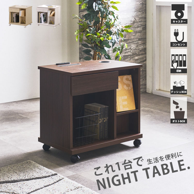 ・すぐ取り合出せるテッシュボックス収納やゴミ箱を隠しながら設置できる利便性が高いナイトテーブル。サイドテーブルや補助作業台としても便利に使用できます。