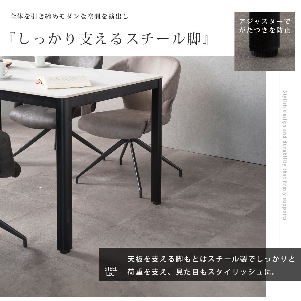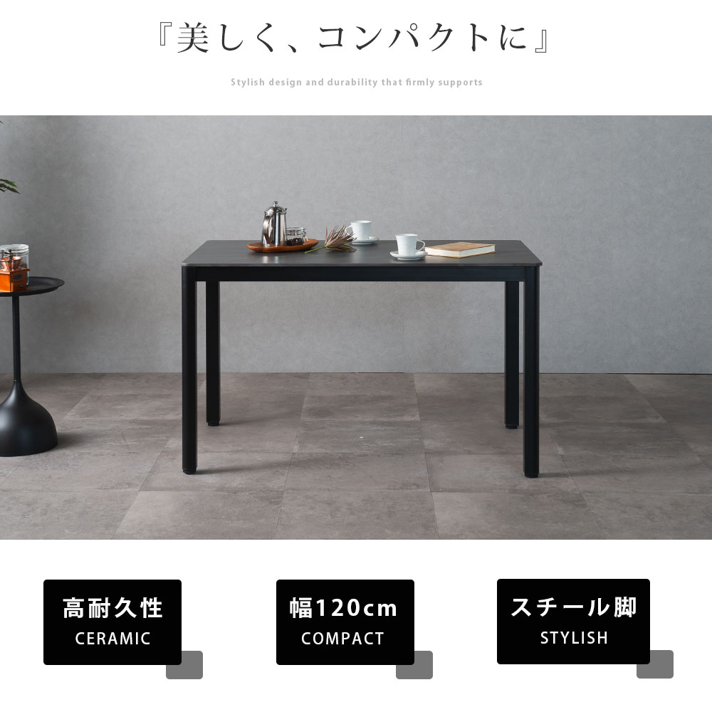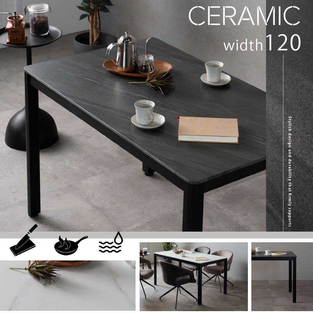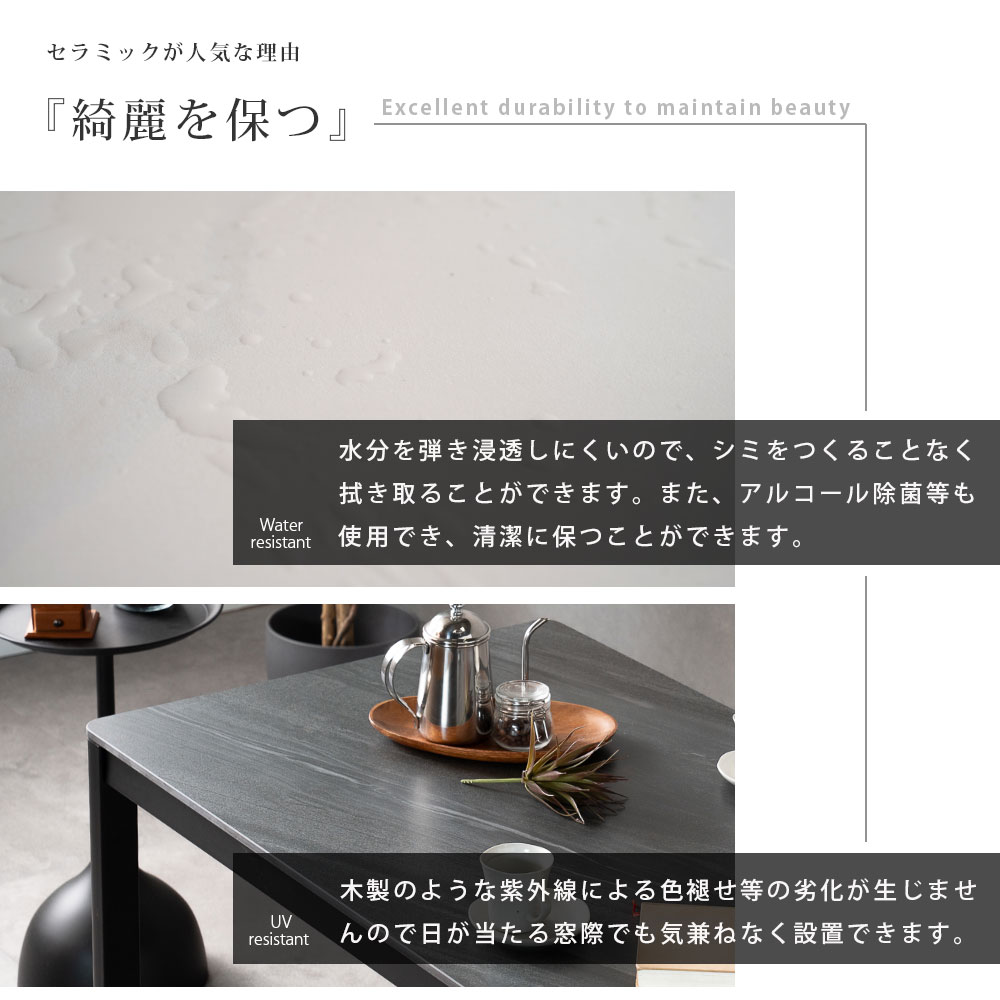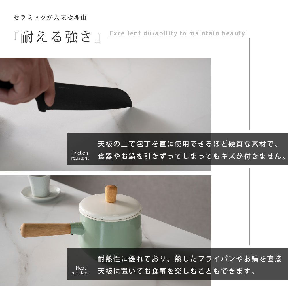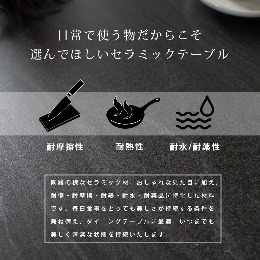 ・陶器の様なセラミック材。おしゃれな見た目に加え、耐傷・耐摩擦・耐熱・耐水・耐薬品に特化した材料 です。毎日食事をとっても美しさが持続する条件を兼ね備え、ダイニングテーブルに最適。いつまでも新品様な美しさを持続いたします。