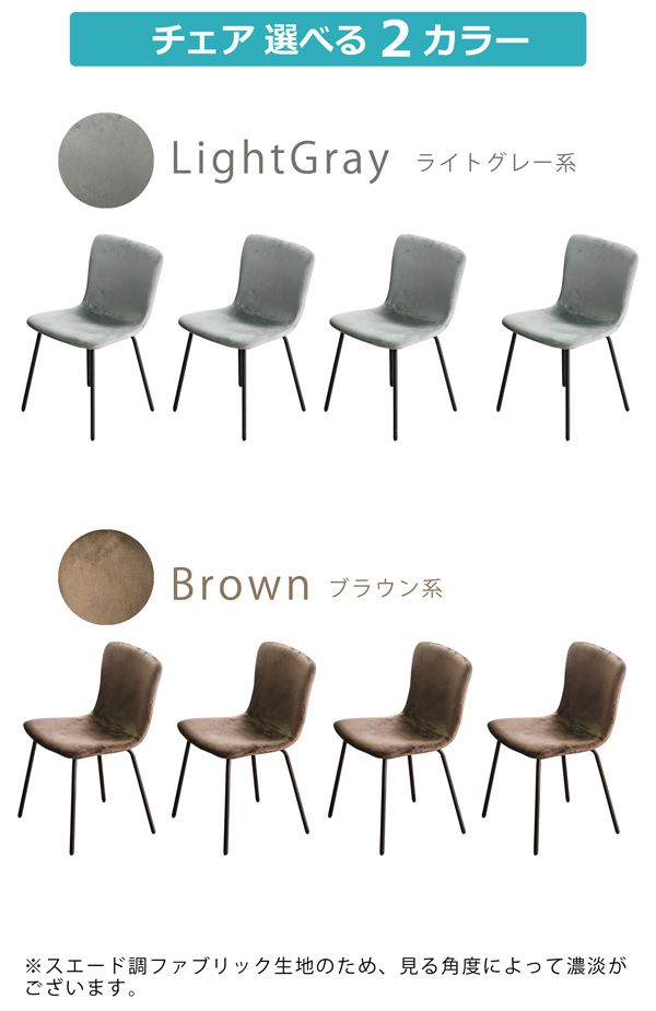 材質:天板=MDF/メラミン化粧板・幕板/脚=ラバーウッド・チェア=スエード調ファブリック・ウレタン・アイアン