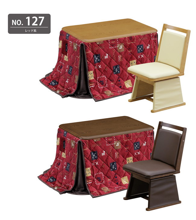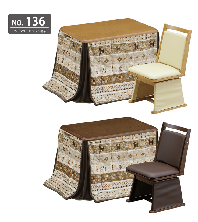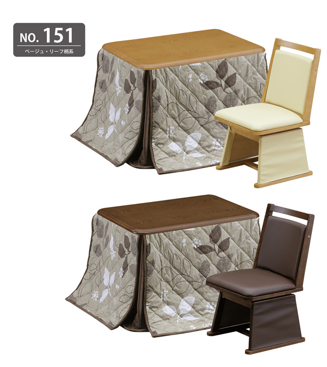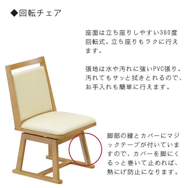材質:天板=MDF木目調(栓柄転写)、UV塗装、脚=木製・チェア=ラバーウッド、合皮レザー、ウレタン・布団=ポリエステル100%
