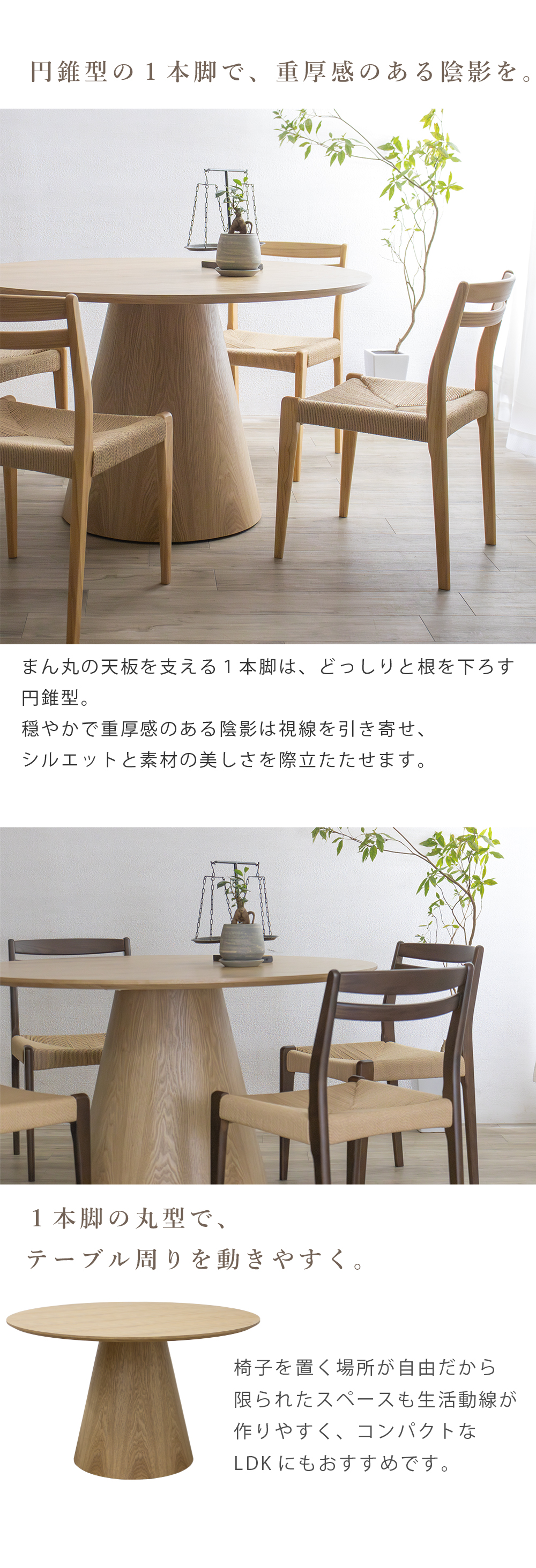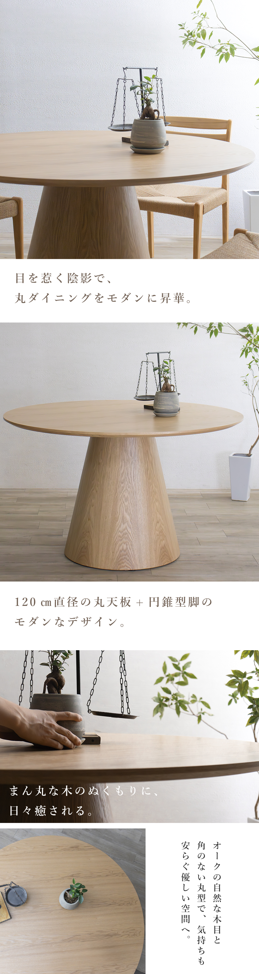 ・120センチ直径の丸テーブルは4人から6人までゆったり使えるサイズです。