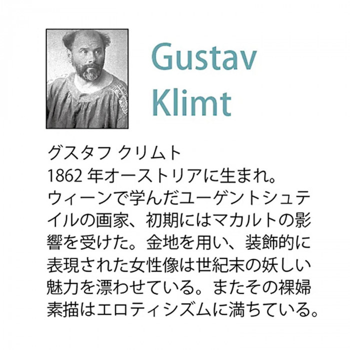 | 絵と額がセットになった商品です。人気の名画にカラフルなモザイク加工を施したアートです。一際目を引くモダンアートへ進化したスペシャルなアートをゴージャスなフレームにセットしました。 作家:オーストリア男性作家(オーストリア男性作家) 1862年生まれ。金地を多用した装飾的に表現された女性像は、世紀末の妖しい魅力を漂わせている。またその裸婦描写はエロティシズムに満ちている。1918年死去。 |
