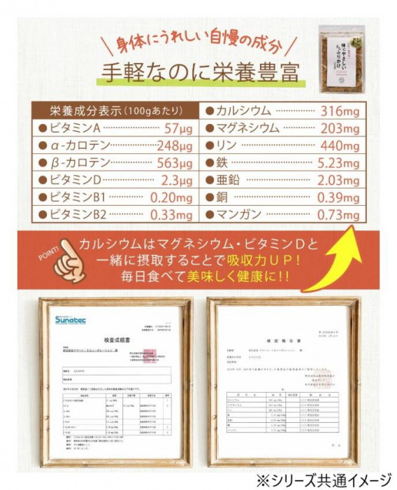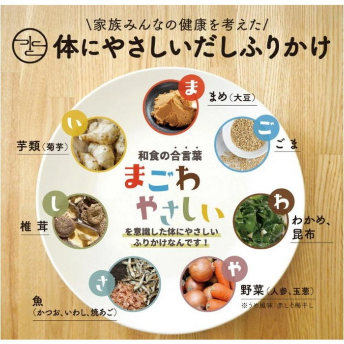 | 原材料 | 名称:ふりかけ みそ風味・納豆入り 米みそ(大豆、米、塩)(国内製造)、乾燥納豆、鰹削り節、岩塩、わかめ、燻製椎茸、鰯煮干し、あおさ、昆布、焼飛魚、乾燥人参、乾燥玉葱、乾燥菊芋、ごま うめ風味 鰹削り節(国内製造)、岩塩、乾燥赤しそ、わかめ、乾燥梅干、鰯煮干し、燻製椎茸、昆布、大豆、乾燥人参、乾燥菊芋、ごま |