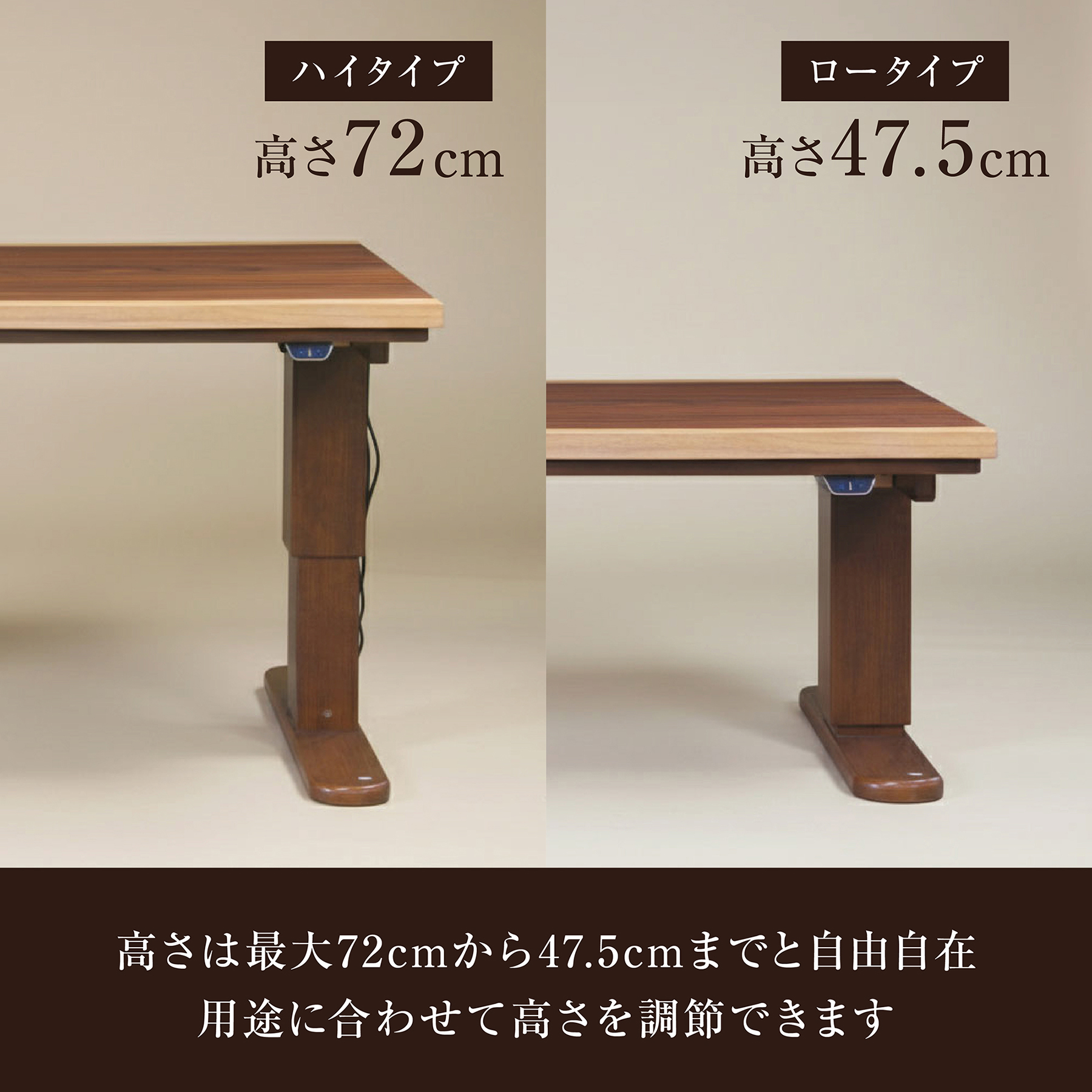 | 特徴 | 【お客様組立て】 ・電動で高さを自由自在に調節でき、一年中快適に過ごせるこたつテーブル ・春夏はダイニングテーブルとして ハイタイプは来客用にもぴったりのサイズ ・秋冬はこたつテーブルに ロータイプは和室にも合います ・高さは最大72cmから47.5cmまでと自由自在 用途に合わせて高さを調節できます ・ウォールナット一枚板風の仕上げを施している天板 ・木目を施した家具調仕上げのしっかりとした脚部 ・手元コントローラーでお好みの高さに簡単に調節できます |