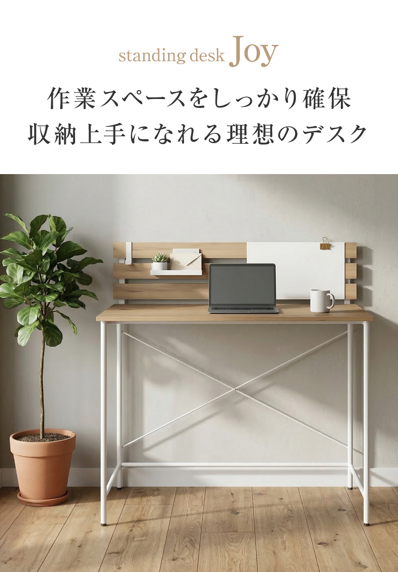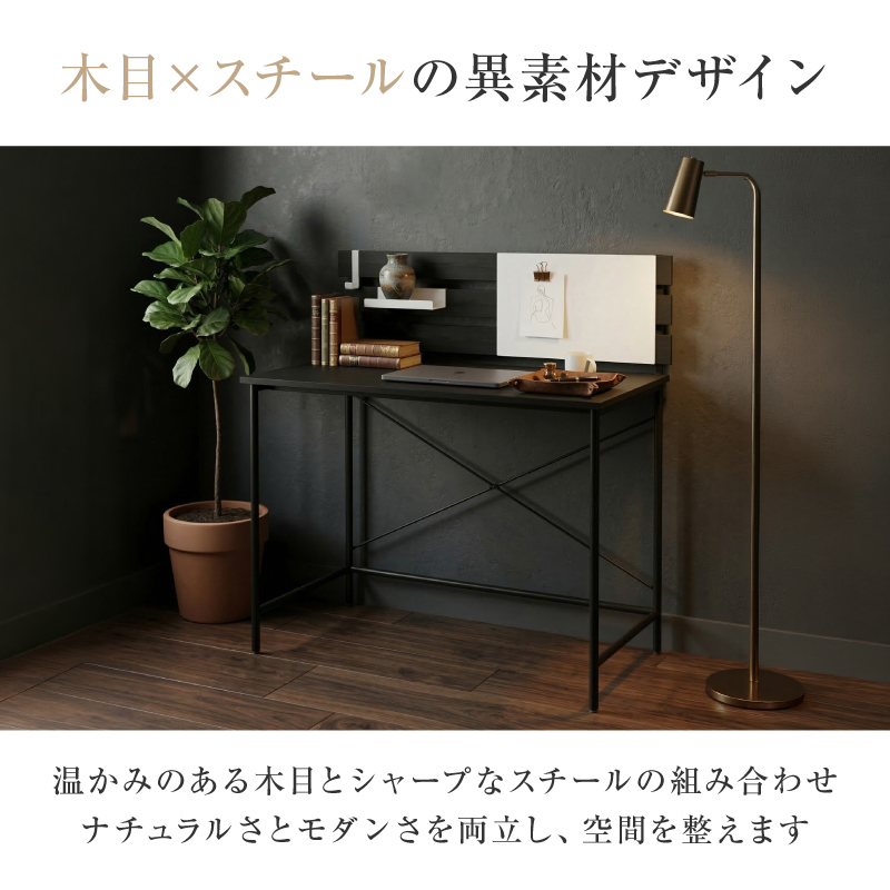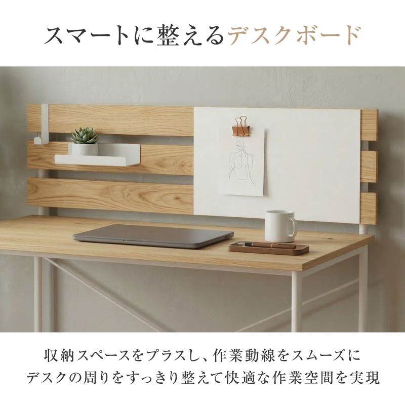 | 特徴 | 作業スペースをしっかり確保 収納上手になれる理想のデスク ・温かみのある木目とシャープなスチールの組み合わせ ・ナチュラルさとモダンさを両立し、空間を整えます ・高さ100cmの設計で空間を立体的に有効活用 ・使いやすいサイズ感で仕事や学習をスムーズにサポート ・デスクボード付きで収納スペースをプラスし、作業動線をスムーズに ・デスクの周りをすっきり整えて快適な作業空間を実現 |