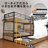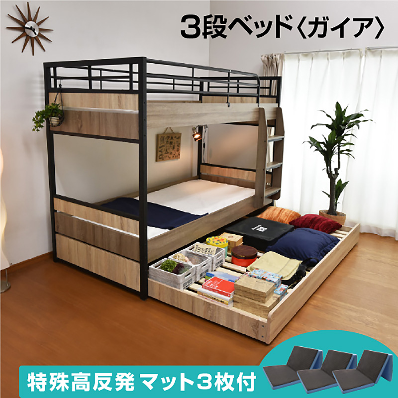 | 当店の おすすめ ポイント | \古木柄とブラックアイアンを組み合わせた3段ベッド/ ・高さわずか160cmとコンパクト ・下段はスライド式ベッドで収納としても使える ・ロータイプだから小さなお子様も安心 ・転落防止のサイドフレーム付き ・床板の中心にフレームを追加して強度をアップ! ・キャスター付きで移動もラクラク ・市販のクリップ式ライト取り付け可能 ・左右取付可能な垂直ハシゴでスペースを有効活用 ・ハシゴの踏み板は幅広10cmで昇り降りがラクラク ・オールシーズン快適なスノコ板 ・シックハウス対策として環境整備基準を満たした資材を使用 |