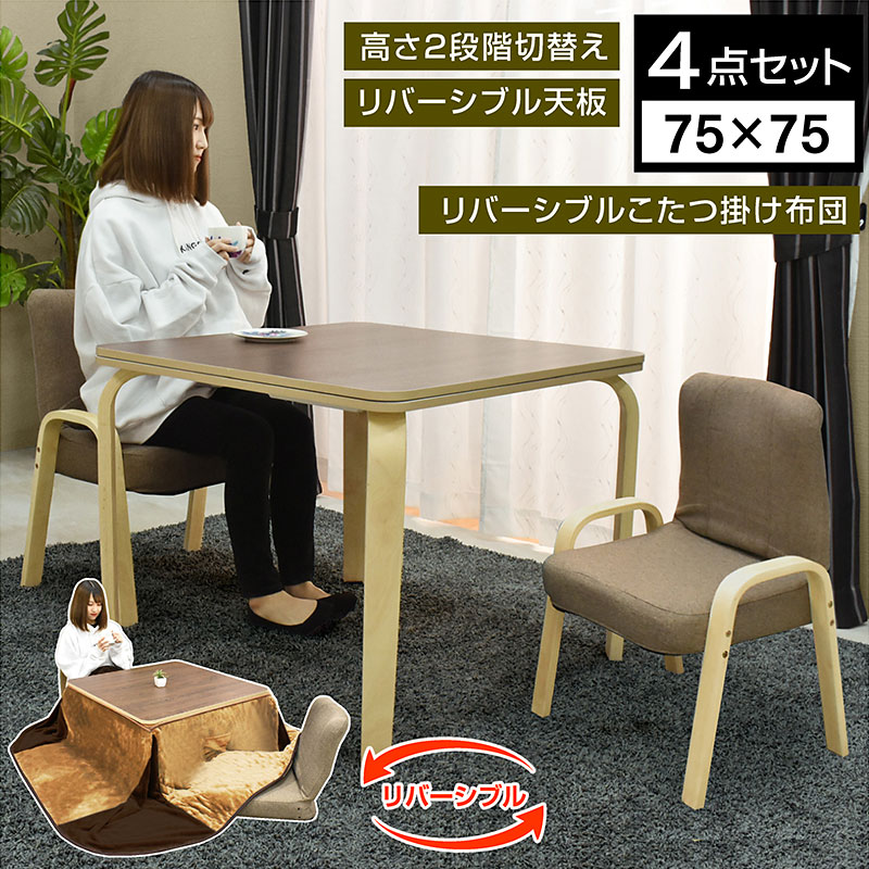| サイズ(cm) | 【テーブル】幅75×奥行75×高64-40 【チェア】幅43×奥行43×高72-46 【こたつ掛け布団】220×220 |