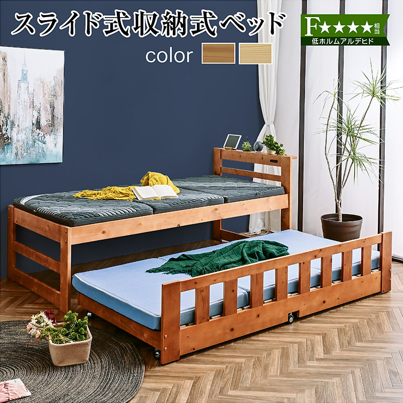 | 当店の おすすめ ポイント | \コンパクトに収納できる親子ベッド/ ・一人暮らしから親子まで便利に使えます。 ・色んな使い方が出来るベッド ・可愛くお洒落デザイン ・来客やお部屋に合わせて自由に出し入れ ・ベッド下を収納として使う事もできます! ・下段ベッドはキャスター付き ・床板には通気性の良いスノコを使用 ・上段ベッドには便利なコンセントと宮棚付き ・選べる2色 |
