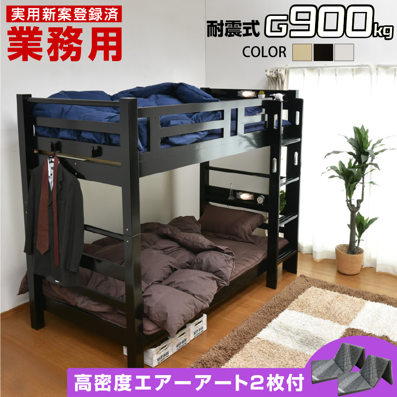 | 特徴 | \アウトレットで激安大特価!/ ・上下段LED照明、スライド式コンセント付き ・垂直はしごでスペースの有効活用が可能 ・上下空間が約1m有り大人でも余裕の出入り ・成人男性5人が乗っても余裕の耐荷重! ・北欧産のパイン無垢材を使用 ・耐震式の上下連結でぐらつきをなくす ・シングルベッド対応 ・社員寮や学生寮・民泊等でもご使用頂けます |