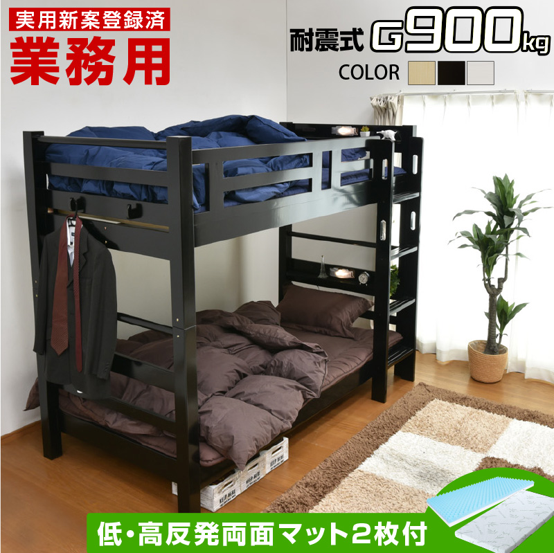 | 特徴 | \アウトレットで激安大特価!/ ・上下段LED照明、スライド式コンセント付き ・垂直はしごでスペースの有効活用が可能 ・上下空間が約1m有り大人でも余裕の出入り ・成人男性5人が乗っても余裕の耐荷重! ・北欧産のパイン無垢材を使用 ・耐震式の上下連結でぐらつきをなくす ・シングルベッド対応 ・社員寮や学生寮・民泊等でもご使用頂けます |