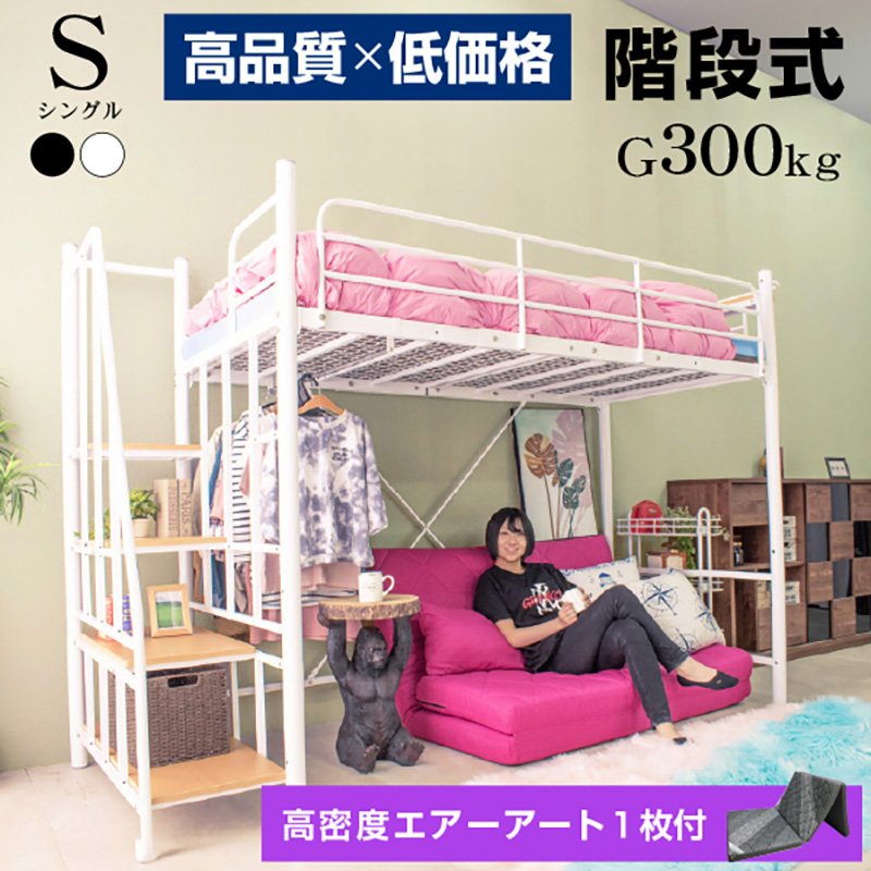| 当店の おすすめ ポイント | ・ベッド下部が有効に使える高さが嬉しい ・ワンルームや子供部屋など狭い空間でも設置可能 ・自由な大空間を有効活用 ・ハンガーパイプ付きで 【シングル】薄手約50着・厚手約25着 【セミダブル】薄手約70着・厚手約35着掛けられる! ・らくらく昇り降り階段付き ・階段は左右どちらでも取付可能 ・階段下を収納やディスプレイラックとしても使用可能 ・宮・移動式コンセント付き ・嬉しい2段階の高さ調整可能 ・宮棚は簡単取り付け、取り外し自由自在 |