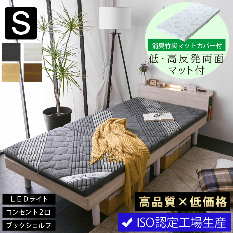 (低・高反発両面マットレス1枚付) すのこベッド LED照明 宮付き 高さ調節 コンセント付 木製 ローベッド ロマン シングル
