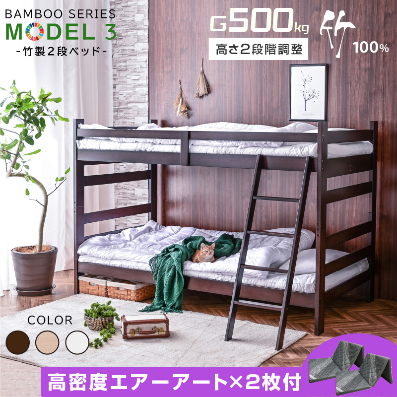 (三つ折りマット エアアート2枚付) グラつかない 竹製 二段ベッド 耐荷重500kg 頑丈 天然木 シングル&キング対応 2段階 高さ調節 SDGs 2段ベッド モデル3
