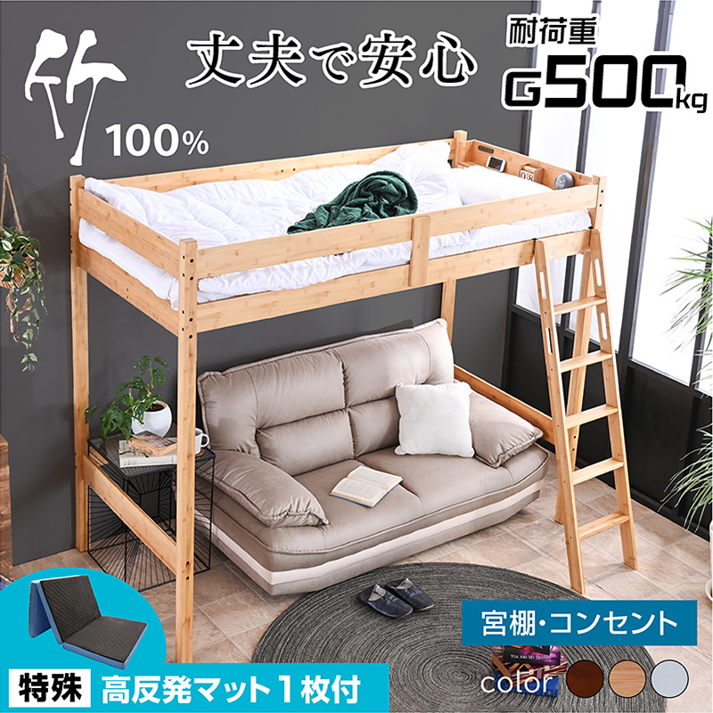 特殊 高反発三つ折りマットレス グラつかない 竹製 ロフトベッド ベッド マットレス付 天然木 SDGs スマホスタンド 宮棚付 2口コンセント モデル4-ART