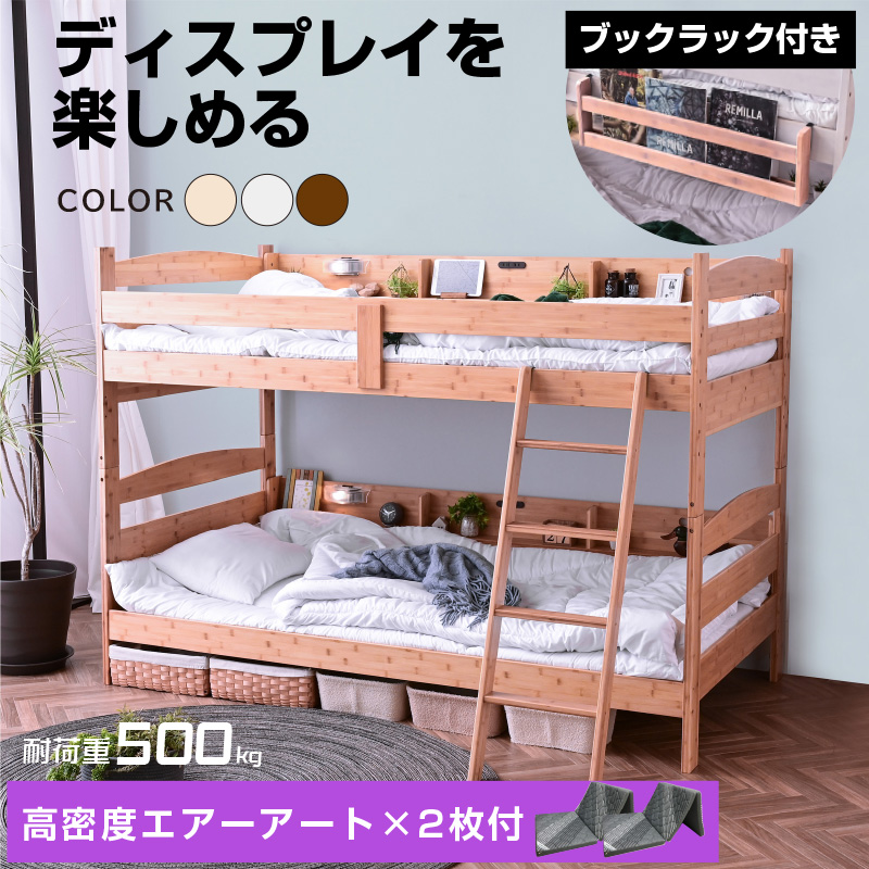 限定100台大特価 グラつかない 二段ベッド 2段ベッド 三つ折りエアーアート2枚付 天然木竹 ディスプレイ楽しむサイド宮棚付 ブックラック 耐震式 500kg モデル7