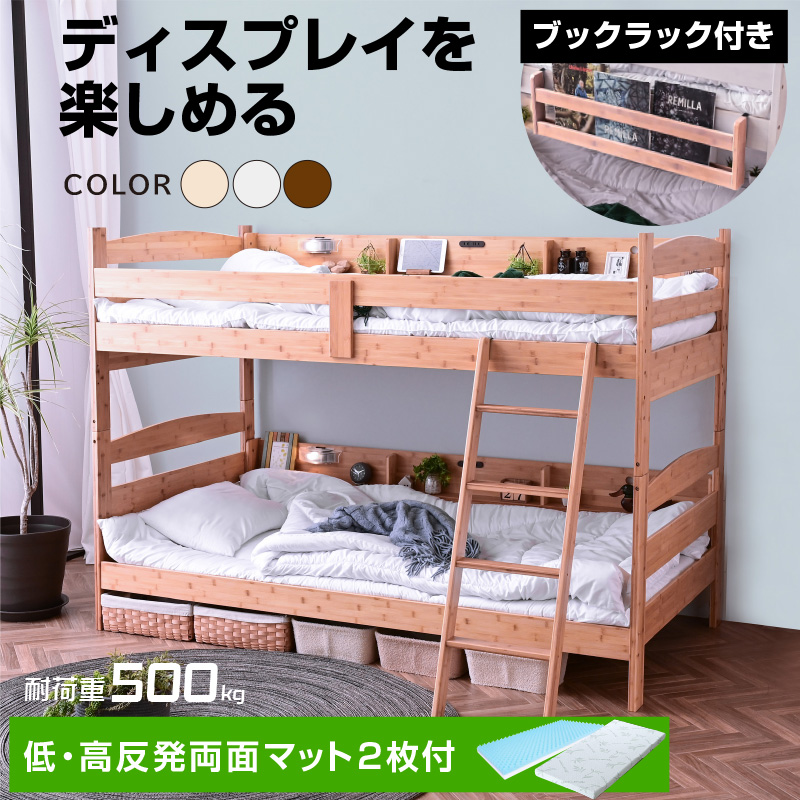 限定100台大特価 グラつかない 二段ベッド 2段ベッド 低・高反発両面マット2枚付 天然木 竹製 サイド宮棚付 ブックラック 耐震式 500kg モデル7-ART