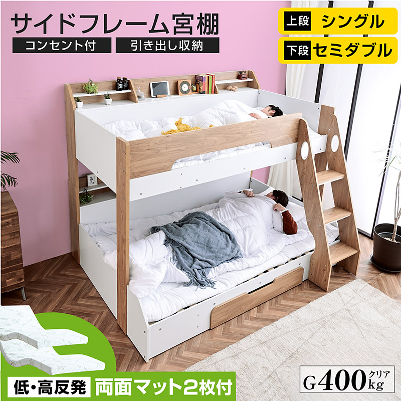 低・高反発 両面マットレス2枚付 2段ベッド 2段ベット 下段セミダブル ロータイプ 宮棚付き コンセント付 シングル対応 木製 おしゃれ かわいい ラブリー2