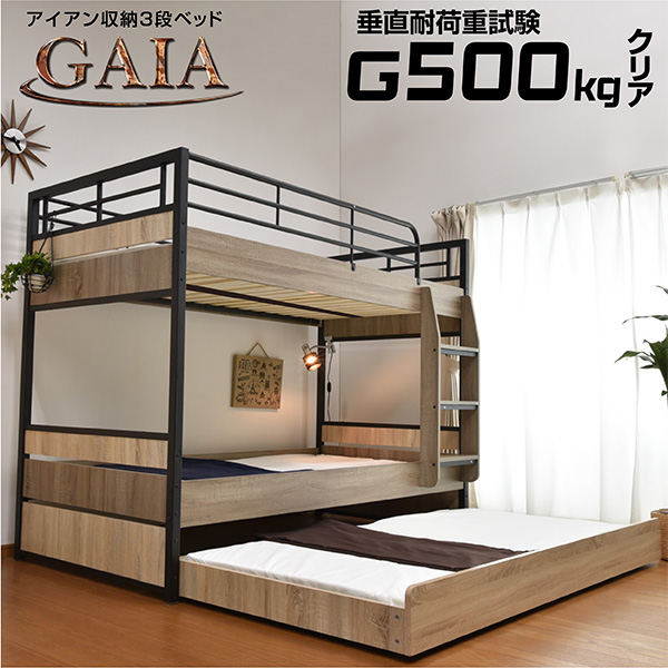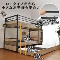 | 当店の おすすめ ポイント | \古木柄とブラックアイアンを組み合わせた3段ベッド/ ・高さわずか160cmとコンパクト ・下段はスライド式ベッドで収納としても使える ・ロータイプだから小さなお子様も安心 ・転落防止のサイドフレーム付き ・床板の中心にフレームを追加して強度をアップ! ・キャスター付きで移動もラクラク ・市販のクリップ式ライト取り付け可能 ・左右取付可能な垂直ハシゴでスペースを有効活用 ・ハシゴの踏み板は幅広10cmで昇り降りがラクラク ・オールシーズン快適なスノコ板 ・シックハウス対策として環境整備基準を満たした資材を使用 |