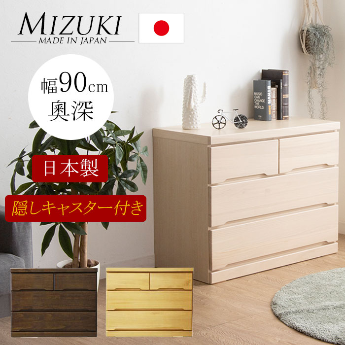 タンス たんす チェスト 木製 ローチェスト 収納 幅90cm 3段 深奧タイプ キャスター付き 日本製 国産 完成品