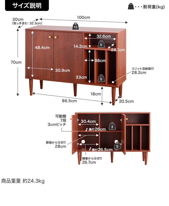 【耐荷重】天板:約15kg 、可動棚板:各約3kg、底板:各約5kg、オープン収納:約5kg、スリット収納:各約5kg